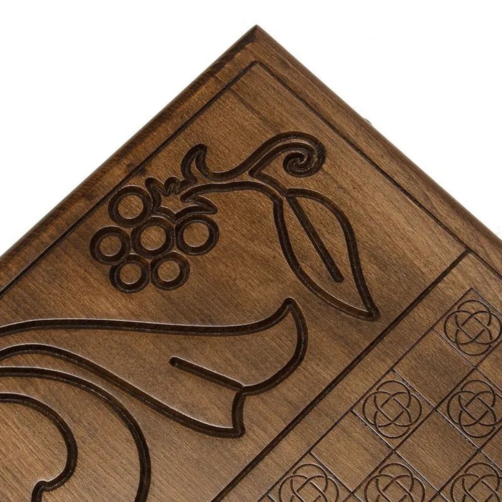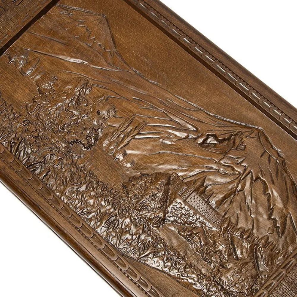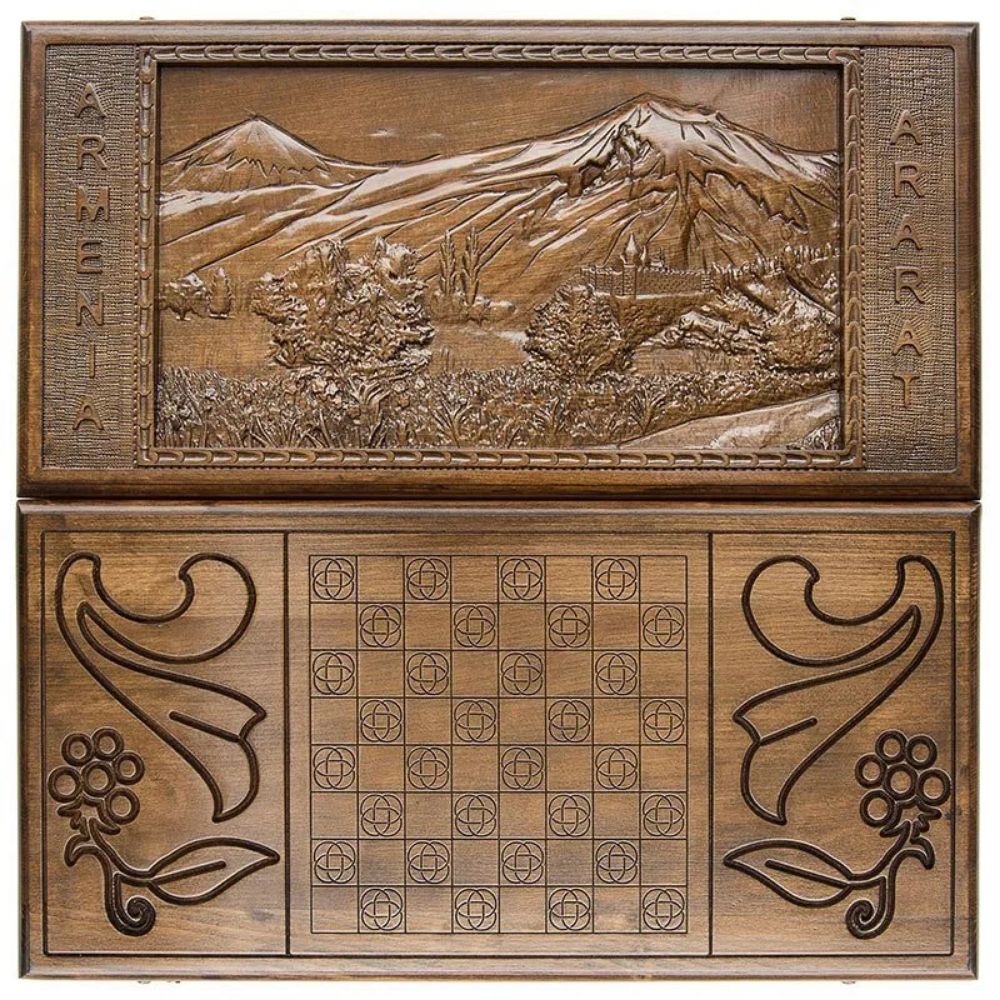 На лицевой стороне вырезан целый пейзаж - на фоне высоких, заснеженных гор, расположилась крепость с башнями, а перед ней раскинулась зеленая Араратская Долина. Когда смотришь на нее, так и хочется собрать вещи и отправиться отдыхать в эти края. Мастер не забыл добавить поле для шашек, которое расположилось на задней стороне. Изнутри, по центру, вырезан символ солнца, от которого отходят лучи к ячейкам. На них, кстати, выполнено мелкое рифление, что является не только украшением, но и повышает удобство при игре.