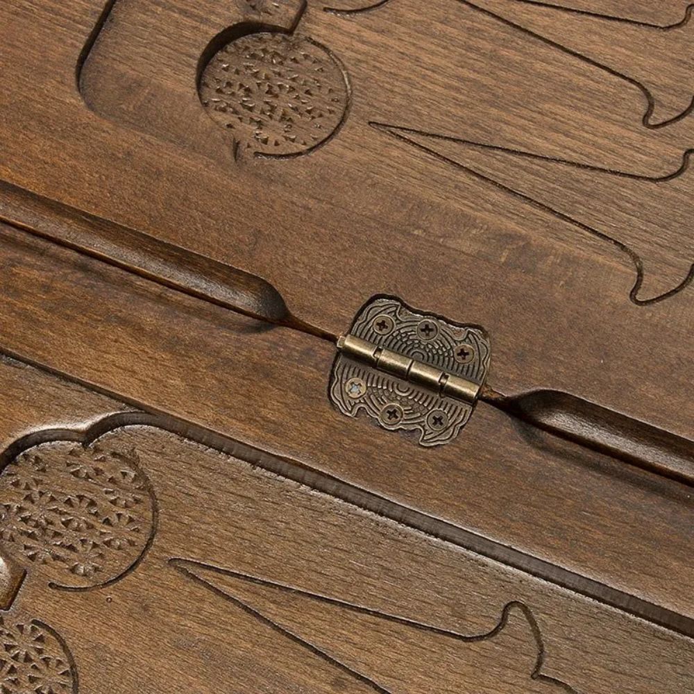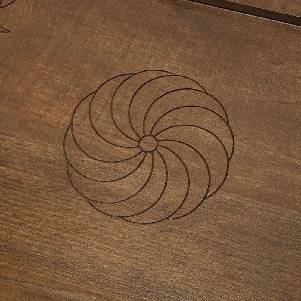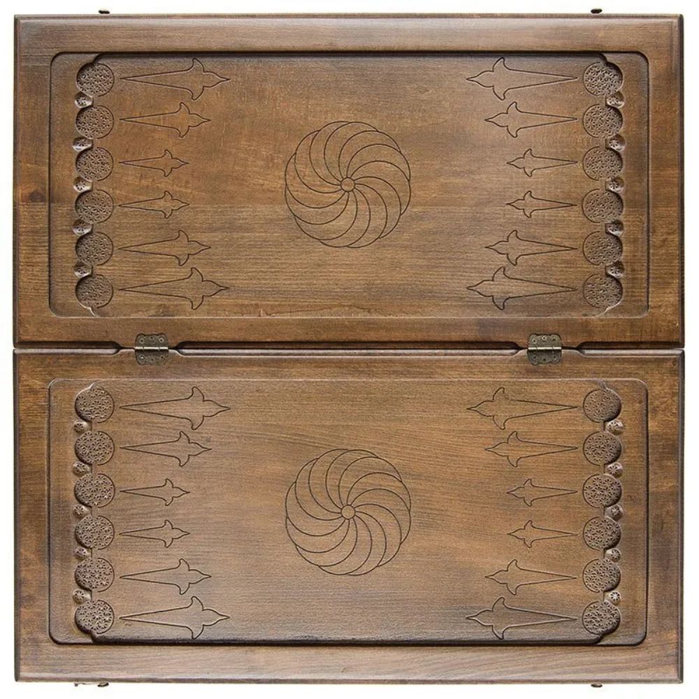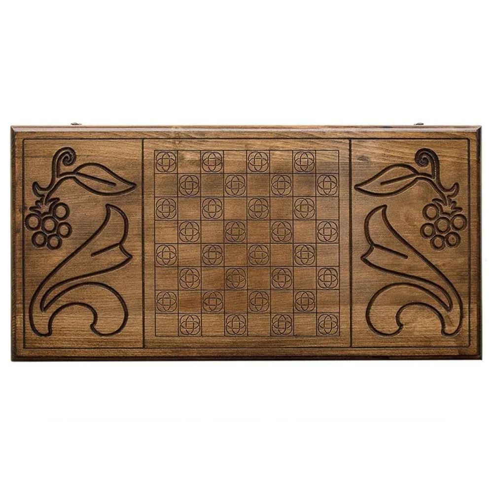 На лицевой стороне вырезан целый пейзаж - на фоне высоких, заснеженных гор, расположилась крепость с башнями, а перед ней раскинулась зеленая Араратская Долина. Когда смотришь на нее, так и хочется собрать вещи и отправиться отдыхать в эти края. Мастер не забыл добавить поле для шашек, которое расположилось на задней стороне. Изнутри, по центру, вырезан символ солнца, от которого отходят лучи к ячейкам. На них, кстати, выполнено мелкое рифление, что является не только украшением, но и повышает удобство при игре.