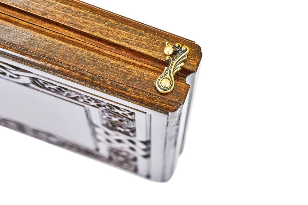 Набор резных нард «Армянский Узор-8» с полем для шашек - произведение искусства, созданное талантливым армянским мастером. Он может стать отличным вариантом подарка для любого фаната классических настольных игр или стать настоящим украшением домашней коллекции настолок. Внешняя сторона доски, скрепленной бронзовыми петлями, украшена традиционным армянским узором. Орнамент впечатляет проработанностью каждой мельчайшей детали и своим качеством. Сама же доска сделана из натуральной буковой древесины. Каждая из фишек, идущих в комплекте, имеет подложку, защищающую доску от царапания.