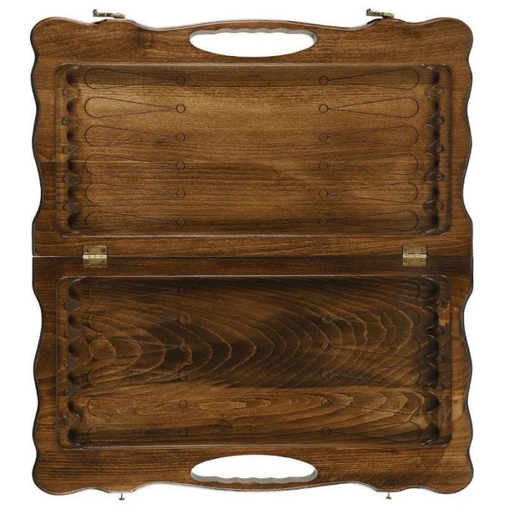 Доска резных нард «Бесконечность-2» выполнена из натурального массива бука и украшена интереснейшим орнаментом, символизирующим по замыслу автора бесконечность. Для долговечности она покрыта защитным лаком. Также износостойкость обеспечивается бронзовой фурнитурой. В комплекте идут все необходимые фишки, каждая из которых имеет защитную подложку, а также пара костей. На оборотной внешней стороне доски нанесено поле для игры в шашки.