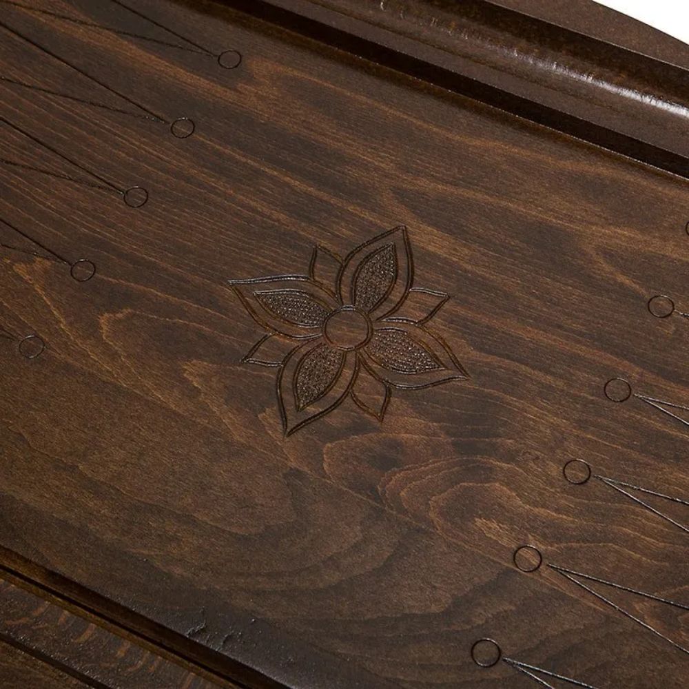 Какой бы ни была красивой доска, если она не сможет служить долгое время и будет ломаться после нескольких партий - никто не будет ее покупать. Говоря о Нарды резные Герб Чечни, сразу же нужно отметить материал изготовления. Цельный массив дуба, позволяет на долгое время забыть о новой покупке. Его высокая прочность обеспечивает достаточное сопротивление механическим воздействиям. Даже если играть ежедневно, а соперники будут попадаться очень агрессивные - никакие удары фишкой о поверхность не смогут ее повредить. Для украшения, на внешней стороне вручную вырезан герб Чечни.