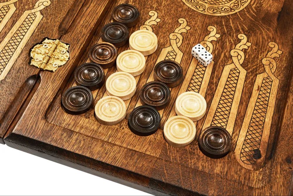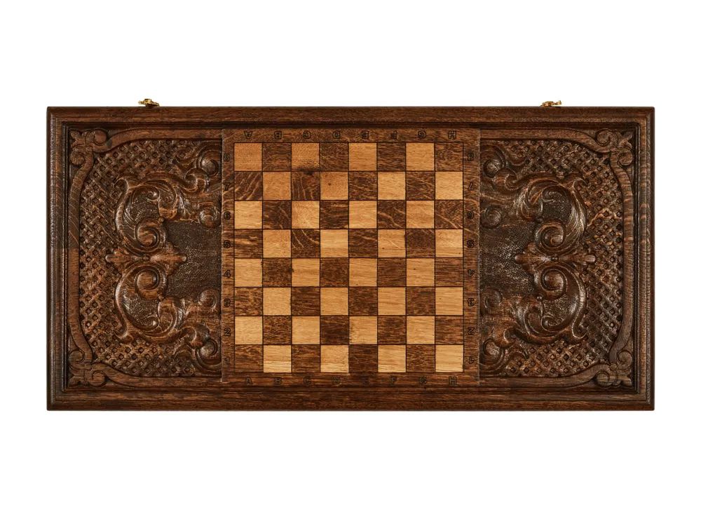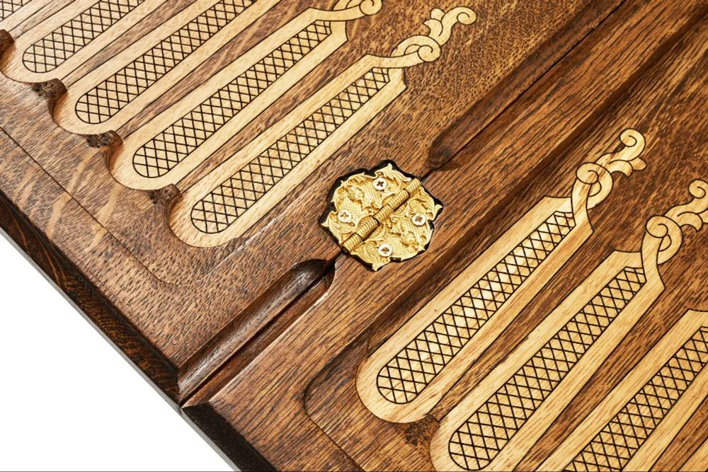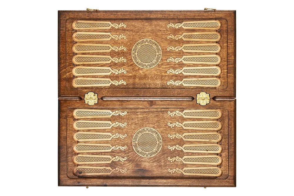 Спереди доска украшена гербом РФ и креативными витиеватыми узорами, а на ее задней стороне нанесено поле для шашек. Внутренняя часть отведена под нарды. Доска покрыта защитным лаком, предотвращающим появление потёртостей и царапин, а также скреплена износостойкой фурнитурой из натуральной меди.