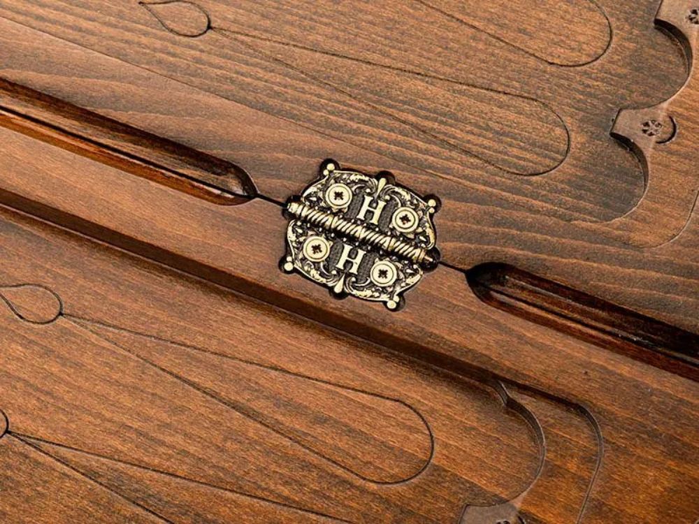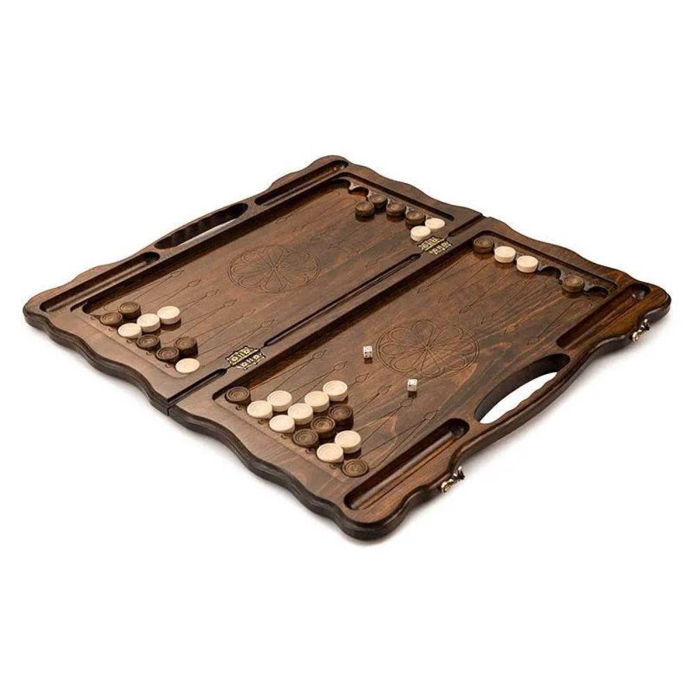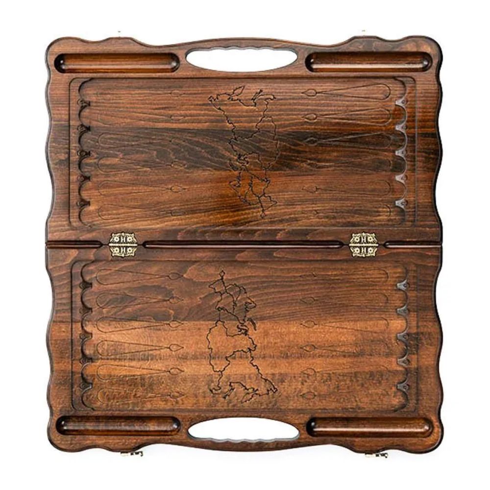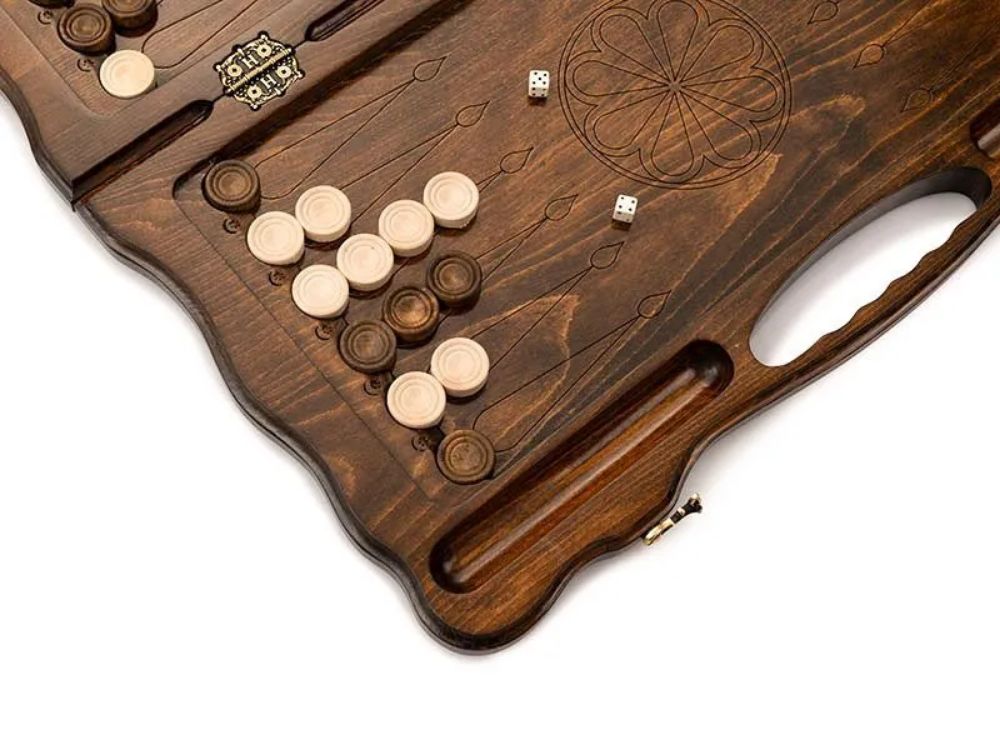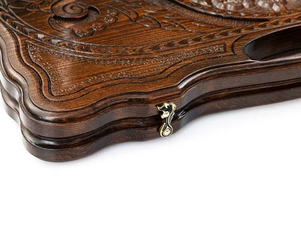 Внешним украшением тут служит вырезанное изображение российского герба. С обеих сторон имеется узор в виде лаврового венка и мелкого текстурирования. На задней поверхности имеется поле для игры в шашки, которое позволит отвлечься от напряженных партий в нарды. Изнутри ячейки подчеркиваются при помощи удлиненных треугольников. На петлях имеется гравировка эмблемы мастера, в форме буквы H. Для переноса в руках предусмотрена ручка с эргономичными прорезями. Мягкий тканевый чехол поможет обезопасить поверхности от налипания грязи и пыли при длительном хранении.
