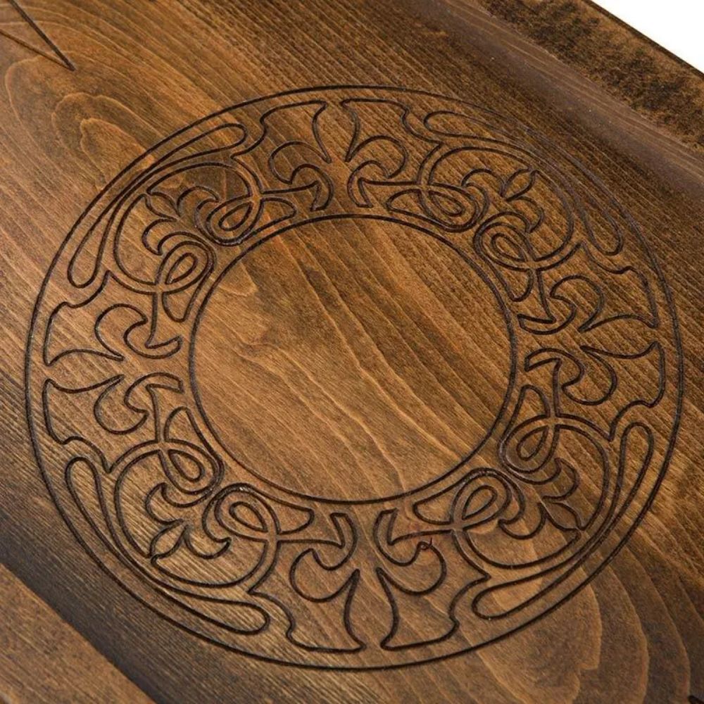 Практически все изделия Устяна, включая это, выполняются из прочного бука. Это обусловлено множеством положительных сторон данного материала - прочный, служит долго даже при частых играх, позволяет вырезать рисунки с мелкими деталями. Кроме этого, внимания заслуживает и текстура, которая нарочито подчеркивается лаком. Она не только придает блеск, но и обеспечивает достаточную защиту от влажности, исключая деформации при попадании жидкостей. Это не значит, что их можно мыть под проточной водой, но если случайно пролить чай или кофе, то достаточно насухо протереть, и ничего плохого не произойдет.