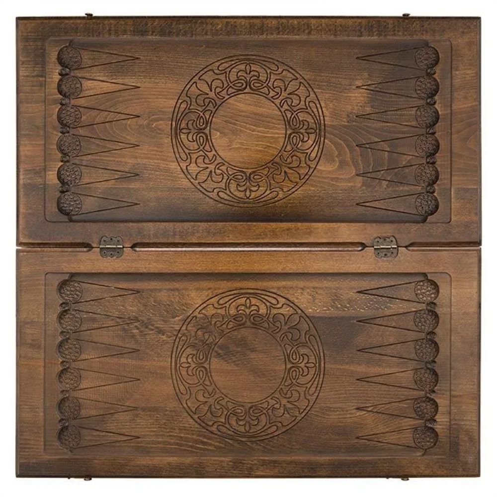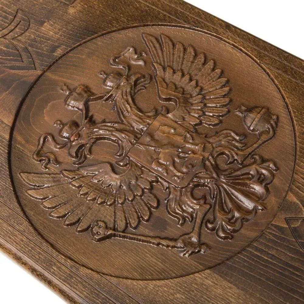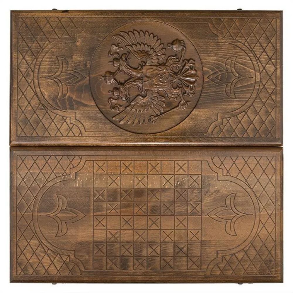 В качестве украшения здесь используется герб России, к которому невозможно придраться - настолько он детализирован и точно выполнен. На противоположной стороне имеется поле для игры в шашки, что позволяет отдохнуть от задумчивых нард. Это с внешней стороны, а внутри вас ждет красивый круговой узор на каждой створке. Дополнительные узоры нанесены на каждую ячейку, что смотрится очень гармонично. Даже петлям и крючку было уделено внимание - они из бронзы и украшены незамысловатым узором. Такое внимание к деталям и уникальный подход к оформлению, позволяют назвать нарды резные Герб РФ-2 идеальной покупкой не только для себя любимого, но и в качестве подарка родственникам, друзьям или коллегам.
