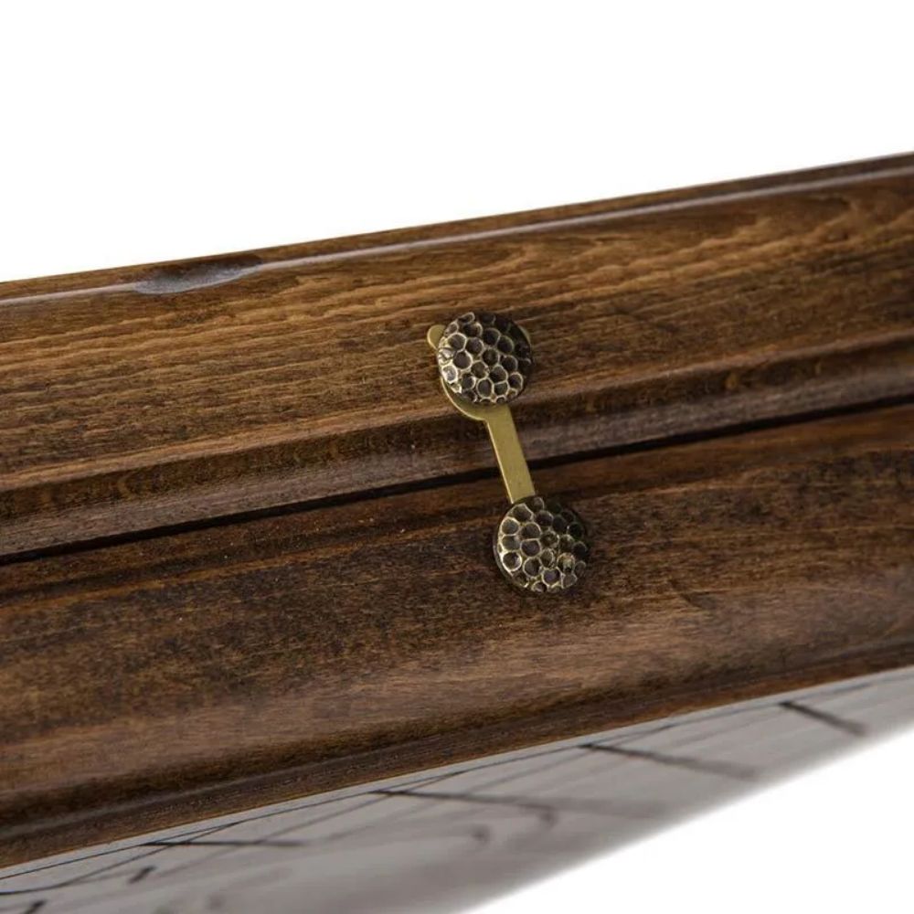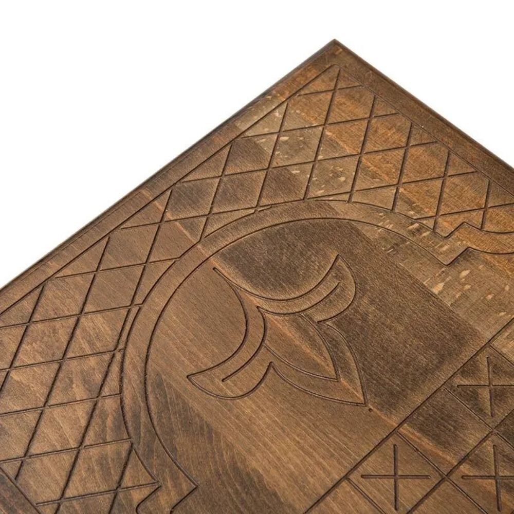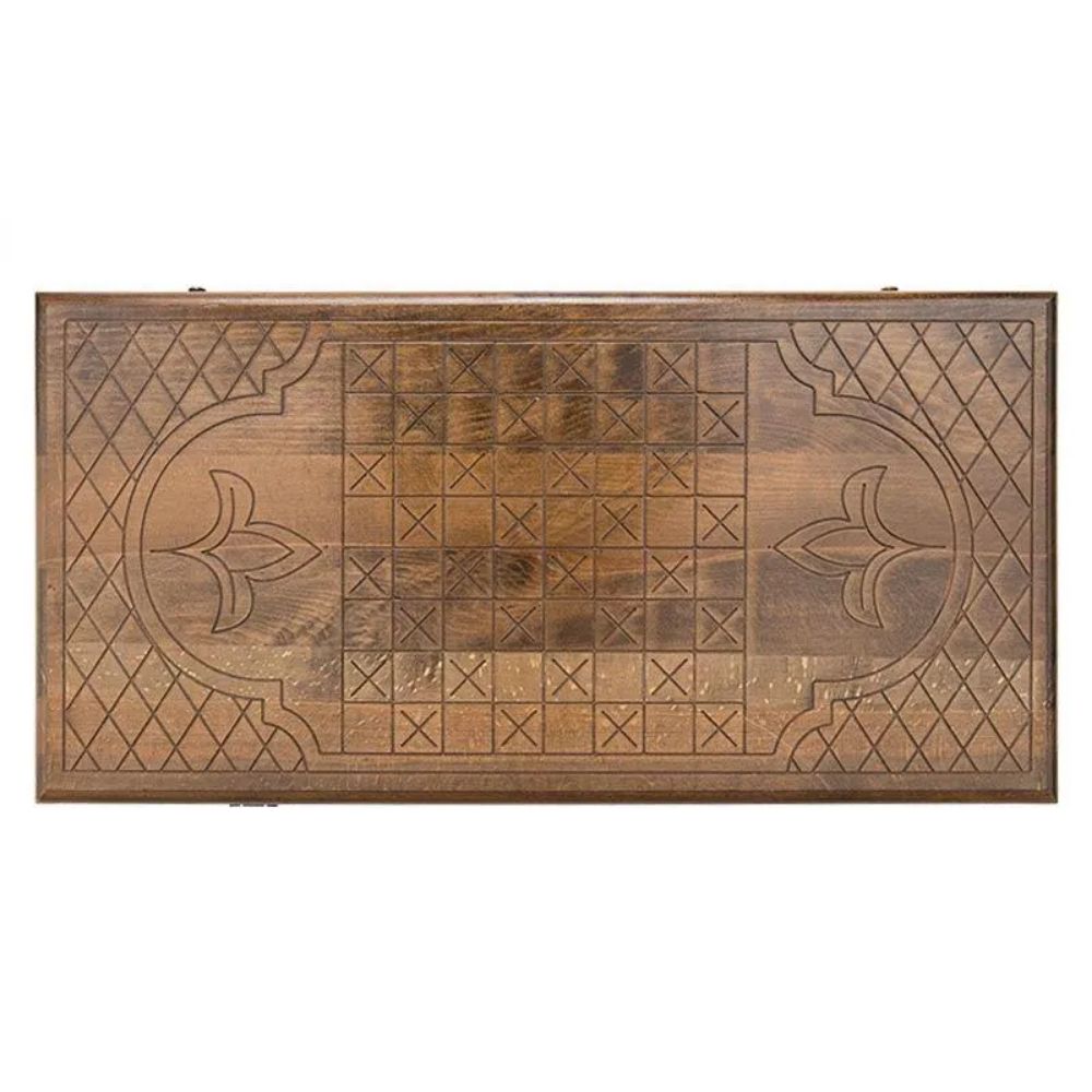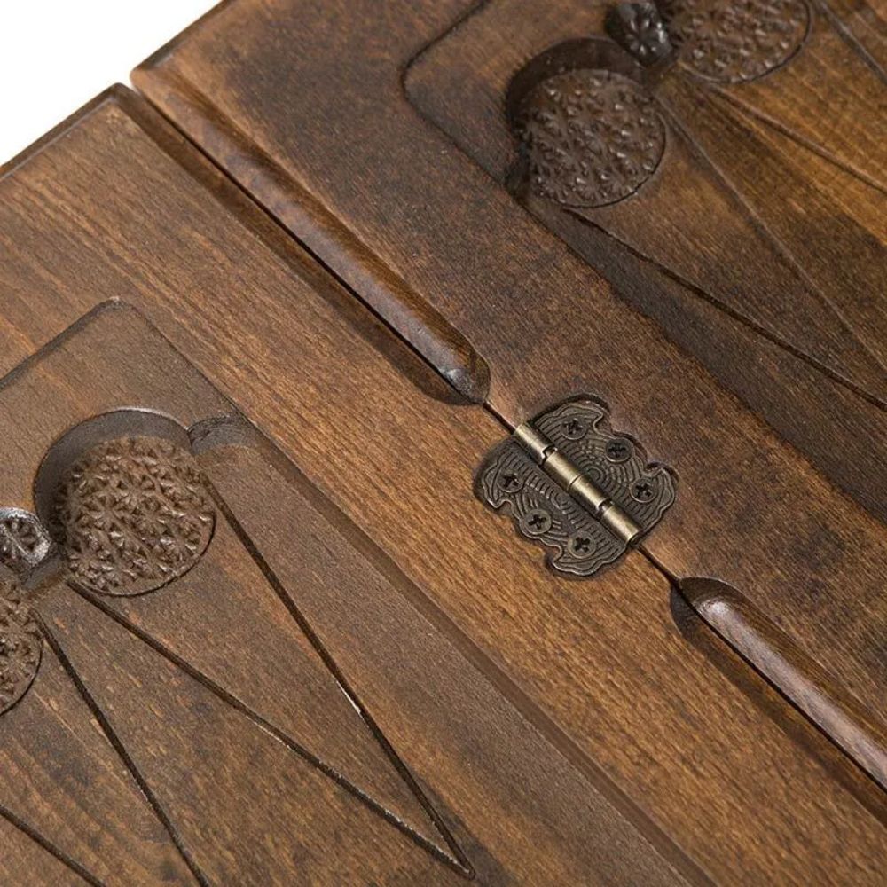 В качестве украшения здесь используется герб России, к которому невозможно придраться - настолько он детализирован и точно выполнен. На противоположной стороне имеется поле для игры в шашки, что позволяет отдохнуть от задумчивых нард. Это с внешней стороны, а внутри вас ждет красивый круговой узор на каждой створке. Дополнительные узоры нанесены на каждую ячейку, что смотрится очень гармонично. Даже петлям и крючку было уделено внимание - они из бронзы и украшены незамысловатым узором. Такое внимание к деталям и уникальный подход к оформлению, позволяют назвать нарды резные Герб РФ-2 идеальной покупкой не только для себя любимого, но и в качестве подарка родственникам, друзьям или коллегам.