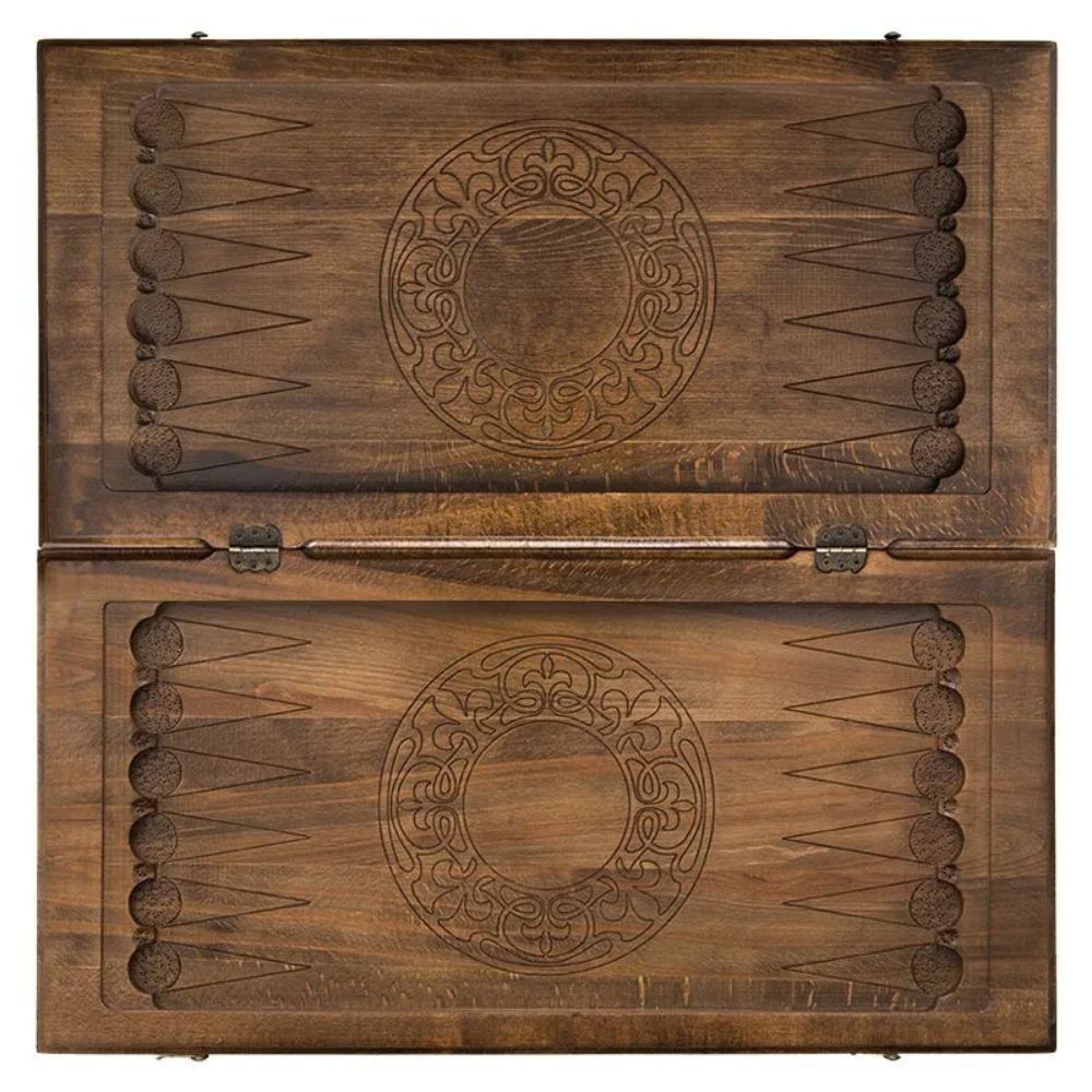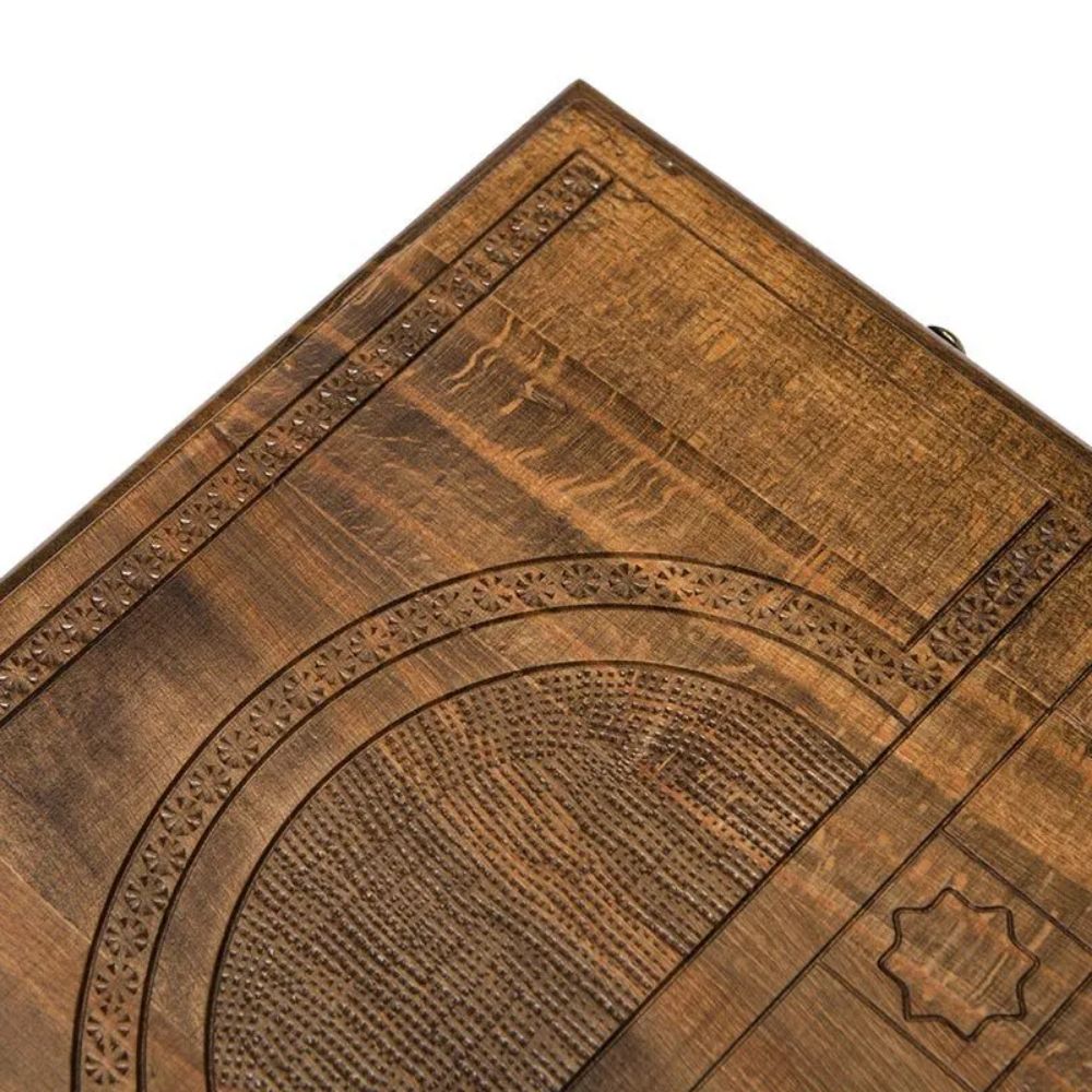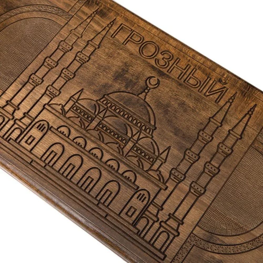 Для улучшения качеств и защиты от влажности, дерево покрывается водоотталкивающим лаком в несколько слоев. Также это придает блеска и подчеркивает особенную фактуру. Сверху одной из створок вырезан детализированный рисунок мечети города Грозного. На другой створке нанесено поле для игры в шашки, окаймленное узором. Внутри доска также украшена круглым узором, как и каждая отдельная ячейка. Ячейки и крючки тоже украшены узором и не выделяются на общем фоне.