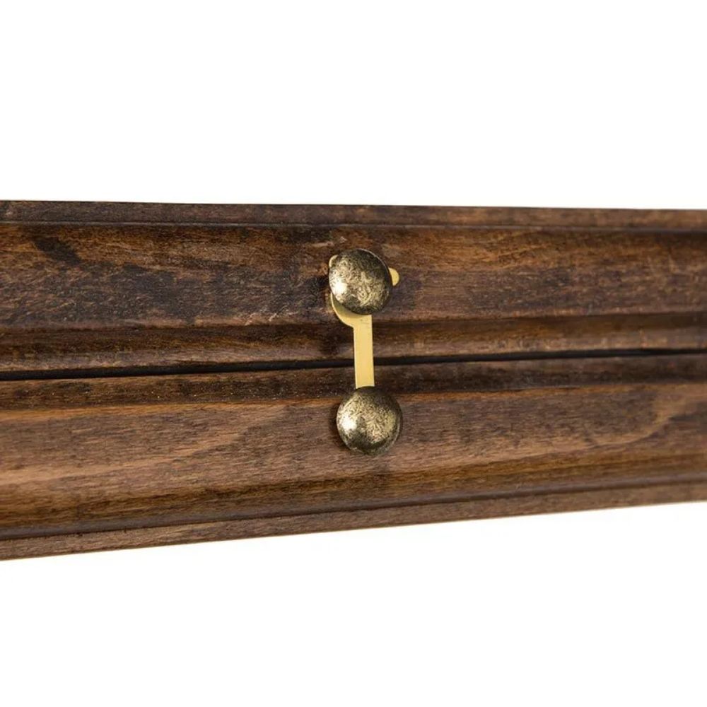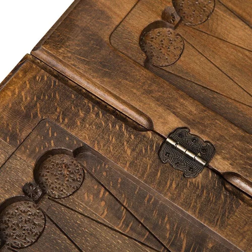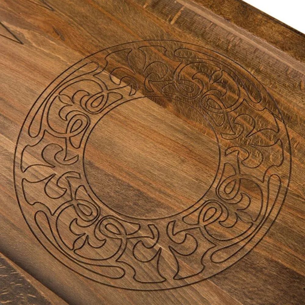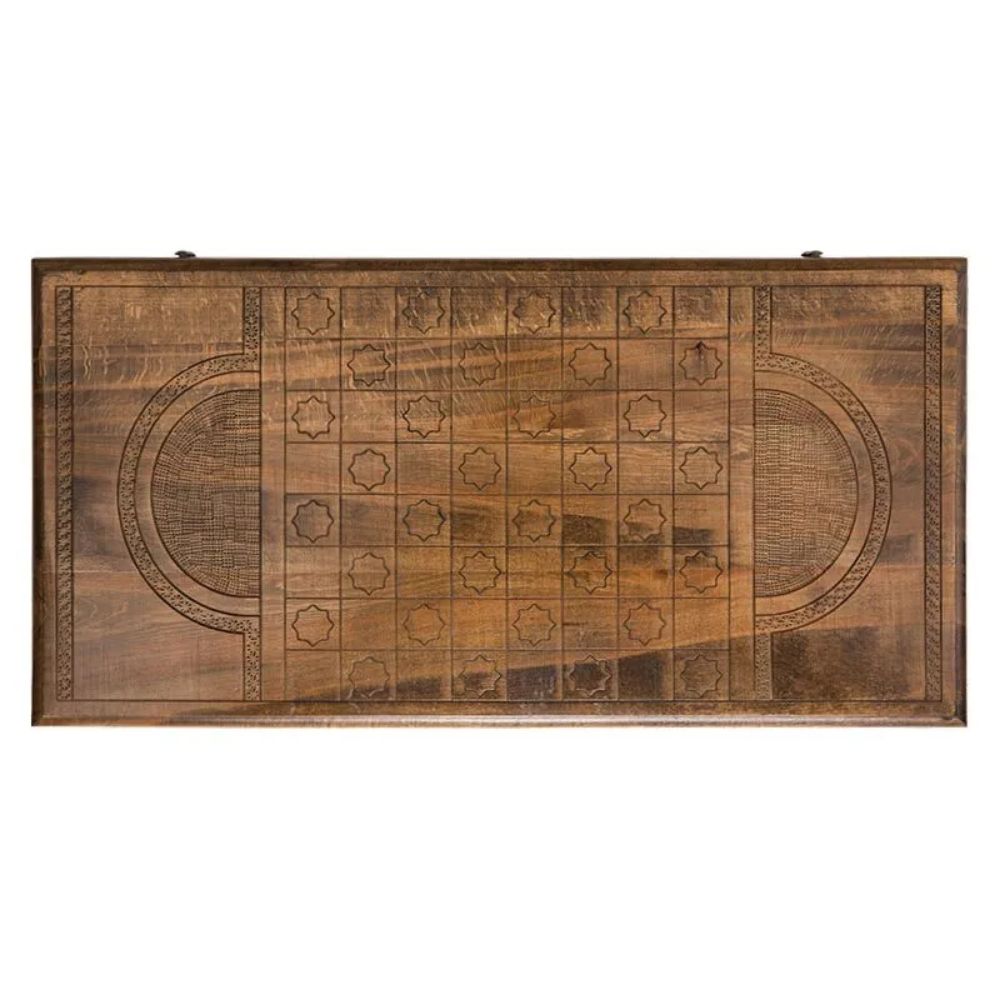 Для улучшения качеств и защиты от влажности, дерево покрывается водоотталкивающим лаком в несколько слоев. Также это придает блеска и подчеркивает особенную фактуру. Сверху одной из створок вырезан детализированный рисунок мечети города Грозного. На другой створке нанесено поле для игры в шашки, окаймленное узором. Внутри доска также украшена круглым узором, как и каждая отдельная ячейка. Ячейки и крючки тоже украшены узором и не выделяются на общем фоне.