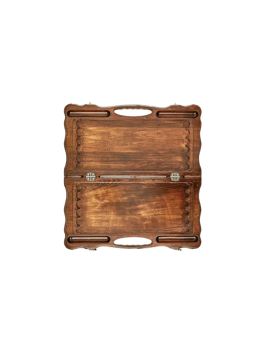 В качестве украшения лицевой панели служит изображение головы льва, находящейся в окружении узора, напоминающего лавровый венок. На обратной стороне имеется поле для игры в шашки, размером 8х8 клеток, для чего можно использовать комплектные фишки. Изнутри подчеркивается текстура дерева, а каждая отдельная ячейка обозначена треугольником.