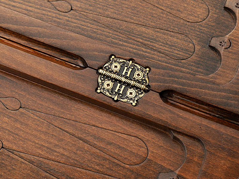На лицевой поверхности вырезано изображение гуляющего льва, а вокруг него выполнен узор в виде лаврового венка и множество мелкой текстуры. С обратной стороны имеется поле для игры в шашки, для чего можно будет использовать комплектные фишки. Изнутри все более минималистично - треугольники около каждой ячейки и подчеркнутая деревянная текстура. На петлях имеется изображение эмблемы мастера в виде буквы H. В комплекте имеется мягкий тканевый чехол, который поможет при транспортировке и длительном хранении, защищая от вибрации и попадания пыли и грязи.