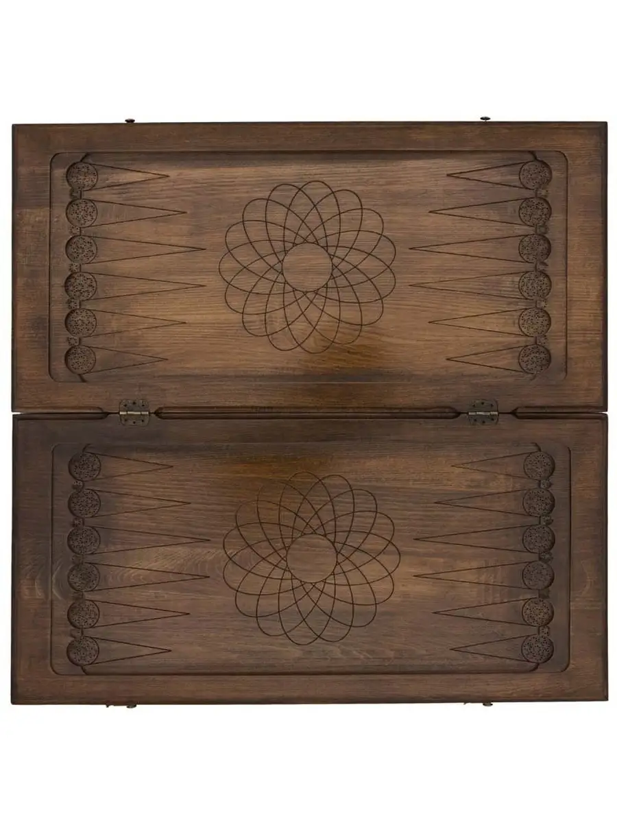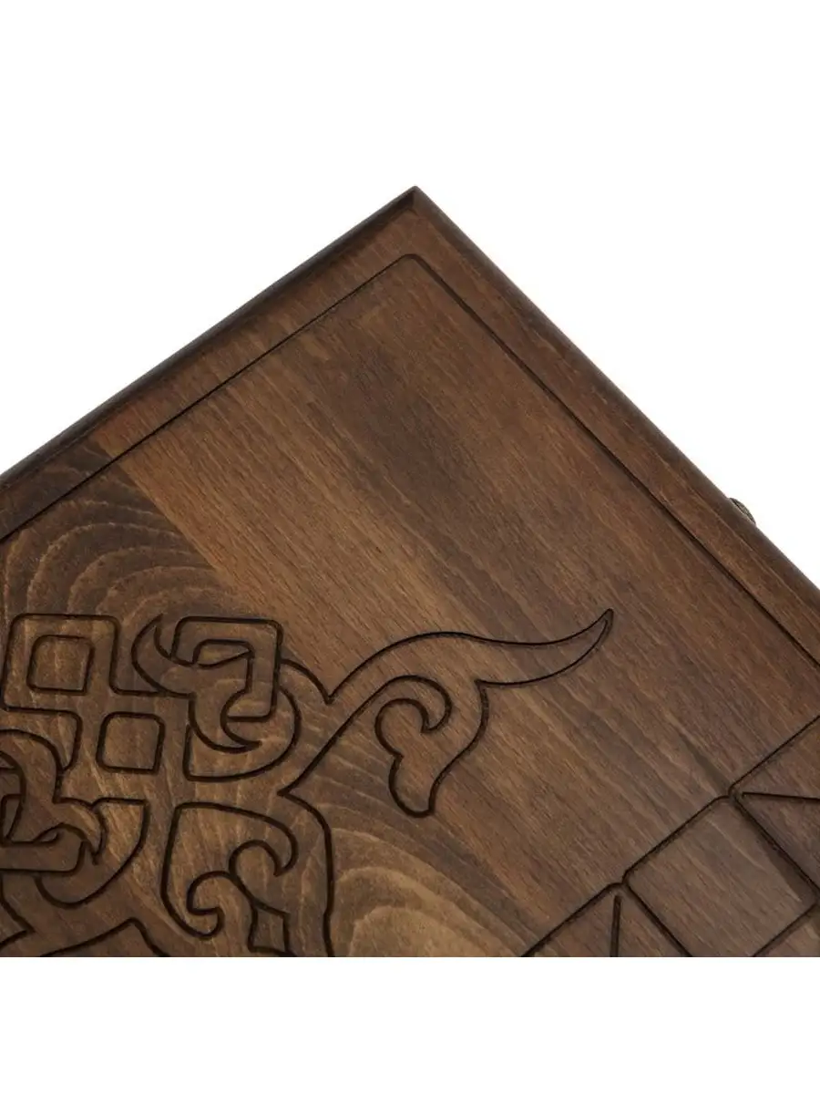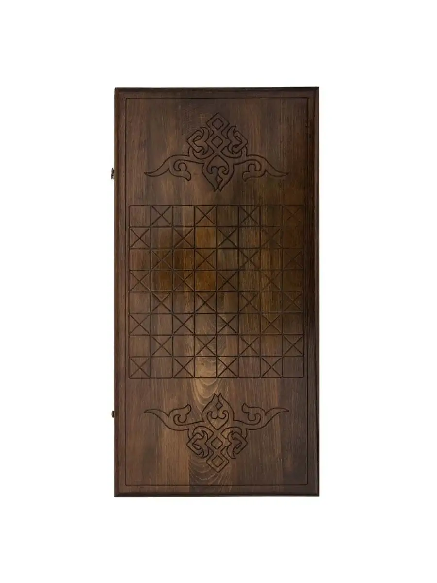 Для украшения используется ручная резьба, причем она коснулась всех элементов. Внешняя поверхность левой створки украшена изображением мечети, а оставшаяся часть покрыта искусным узором. На правой створке с внешней стороны также имеется узор и предусмотрена разлиновка для игры в шашки. Это является обязательным атрибутом хорошей доски, ведь нужно как-то отвлекаться от постоянного мыслительного процесса. Изнутри, по центру расположен радиальный рисунок, а каждая ячейка отдельно помечается резкой.