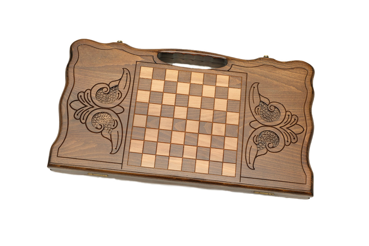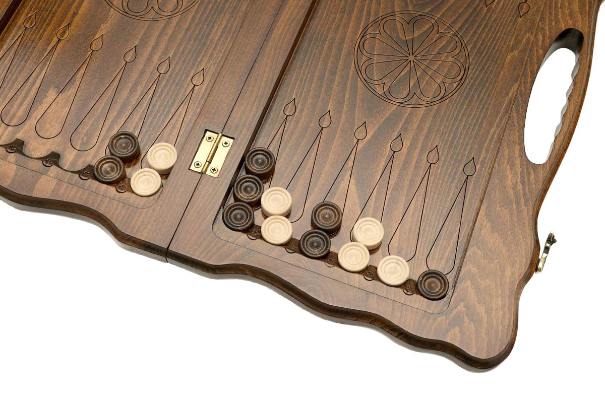 На внешней стороне, опять же вручную, вырезаны специфичные узоры, окаймляющие круг, внутри которого красуется медведь. Мастер уделил внимание деталям и на теле зверя видно каждый волосок. В этих нардах все находится в гармонии - сама доска, петли, крючки, фишки и игральные камни. Это говорит о том, что в это изделие вложена душа человека, который своими руками держал инструмент и вырезал малейшие детали.Не только доска