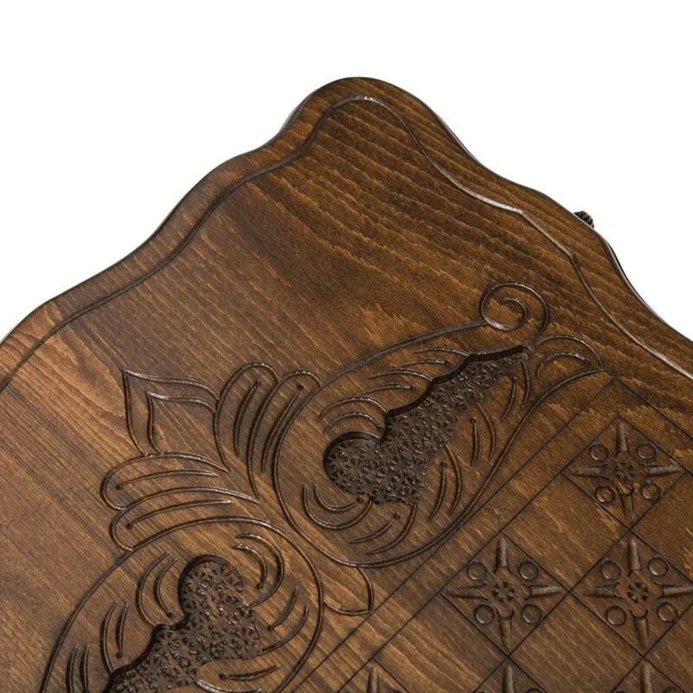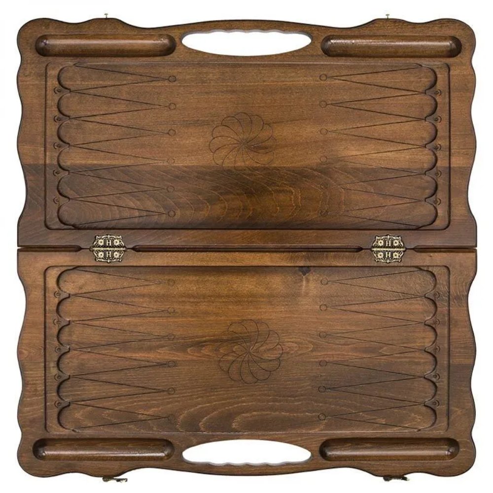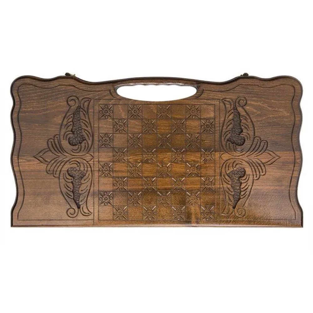 Для украшения здесь используется целая картина - двое охотников с копьями, в лесах Армении, охотятся на огромного медведя. Детализация поражает и ничуть не уступает современной лазерной резьбе. Есть поле для шашек, которые позволят отдохнуть, когда голова устанет от напряженных партий в нарды.