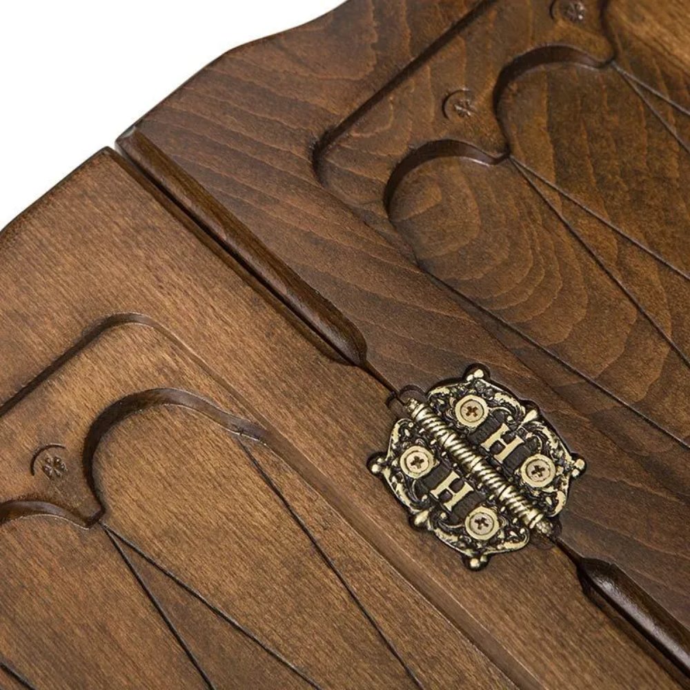 Мастер предусмотрел возможность носить нарды с собой и вырезал удобную ручку сбоку доски. К тому же, в комплекте имеется чехол, достаточный, чтобы защитить это «творение» от пыли, грязи и брызг. В случае падения или удара она тоже не пострадает, т.к. чехол из ткани и послужит хорошим амортизатором.