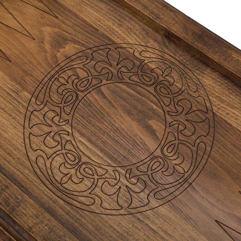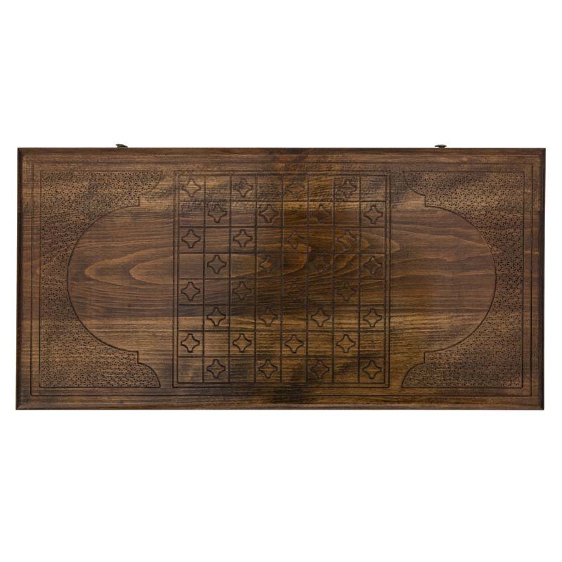 Используется древесина, но не обычная, а буковая. Причем деревья достаточно старые, что обеспечивает достаточную прочность. Она необходима, когда во время ожесточенных сражений, соперники начинают со злостью передвигать фишки по поверхности. Дерево, вкупе с несколькими слоями лака, обеспечивает наилучшее скольжение и не позволяет появиться трещинам, мелким сколам и тому подобном. Бук легок в обработке - даже при создании мелких узоров, которыми здесь украшена практически вся поверхность, не происходит растрескивания.