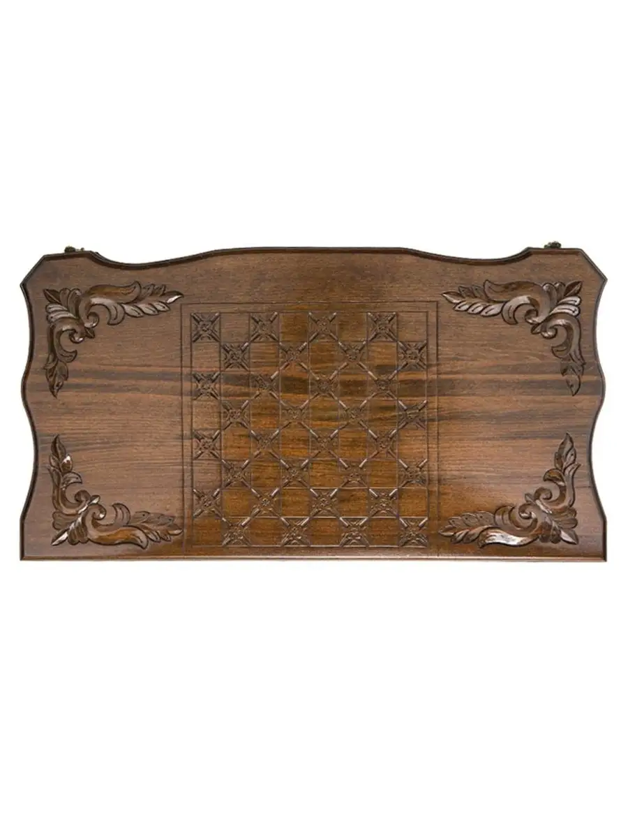 На внутренней стороне вырезаны ячейки, как раз по размеру фишек, а в середине также имеется символичный рисунок. Внимание мастер уделил даже петлям, которые тут выполнены из бронзы, с гравировкой буквы H, которая является эмблемой изготовителя. Бронзовые также и крючки, опять же с узорчатым оформлением. На краях доски предусмотрены небольшие углубления, куда можно помещать фишки, вышедшие из игры и зарики.
