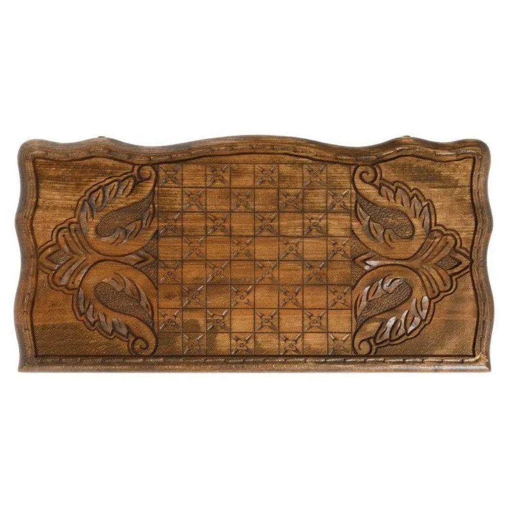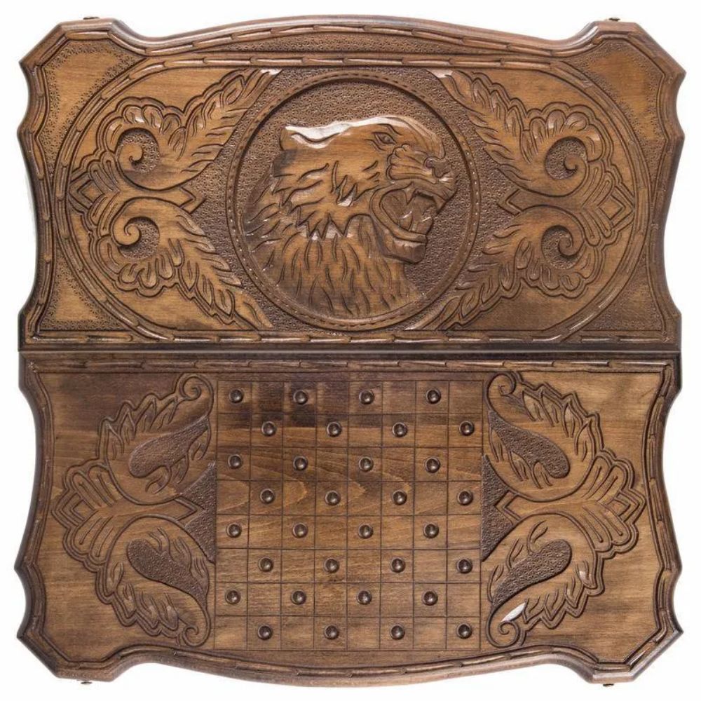 Набор резных больших нардов «Тигр» выполнен вручную частным мастером из Армении Саркисом Петросяном. Представленный комплект содержит короб, 16 темных и 16 светлых фишек, два игральных кубика (кости), а также плотный чехол из качественной ткани для максимальной сохранности набора в неповрежденном состоянии. Короб, кубики и фишки изготовлены из бука. Внутренняя поверхность короба размечена для игры, а на внешней имеется резное изображение тигра в круглой рамке по центру крышки. Эта композиция обрамлена орнаментом. Короб покрыт лаком, который оттеняет естественную фактуру древесины и защищает ее от царапин.