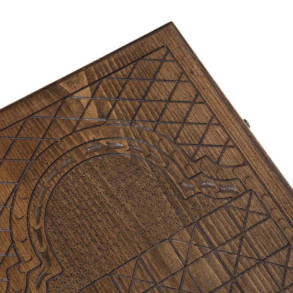 Здесь этому уделено немалое внимание, что является изюминкой данного производителя. На лицевой поверхности расположилось изображение Льва, соответственно знаку Зодиака. На задней стороне присутствует поле для игры в шашки, для чего можно будет использовать комплектные фишки. Изнутри все также интересно - крупный узор посередине и мелкие на каждой отдельной ячейке.