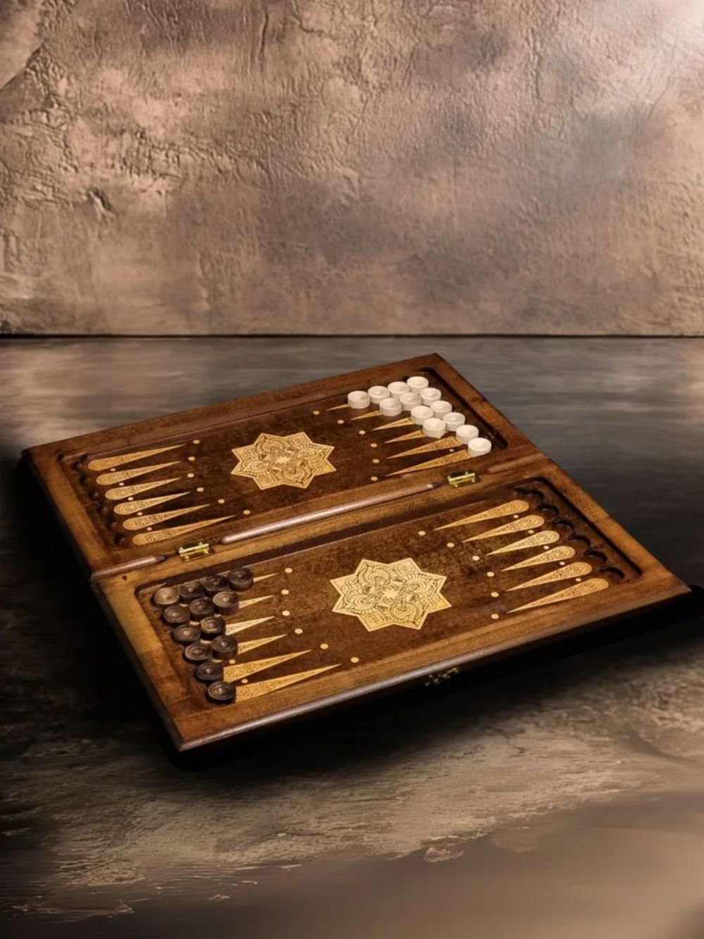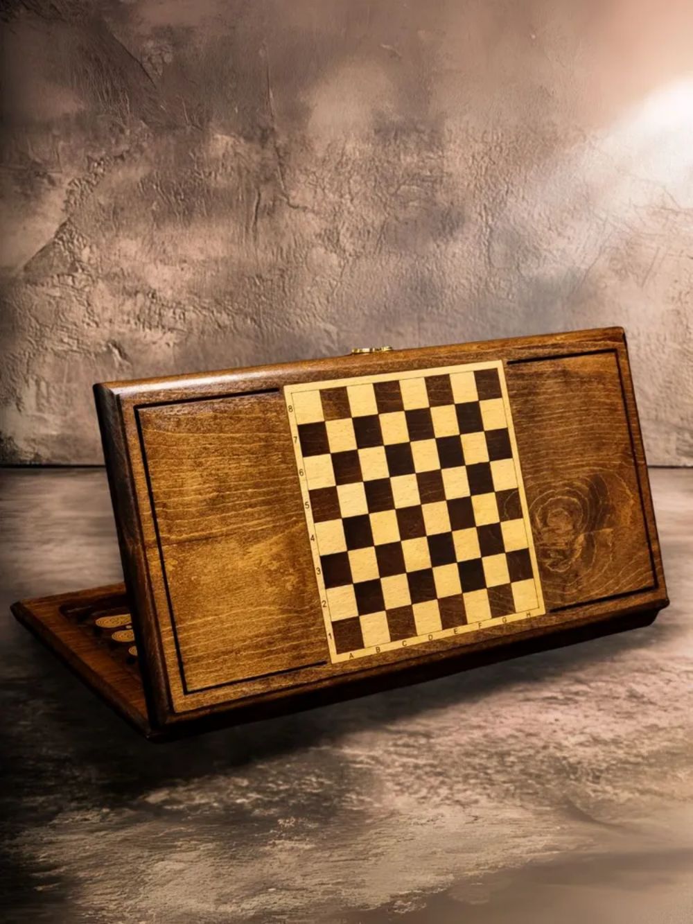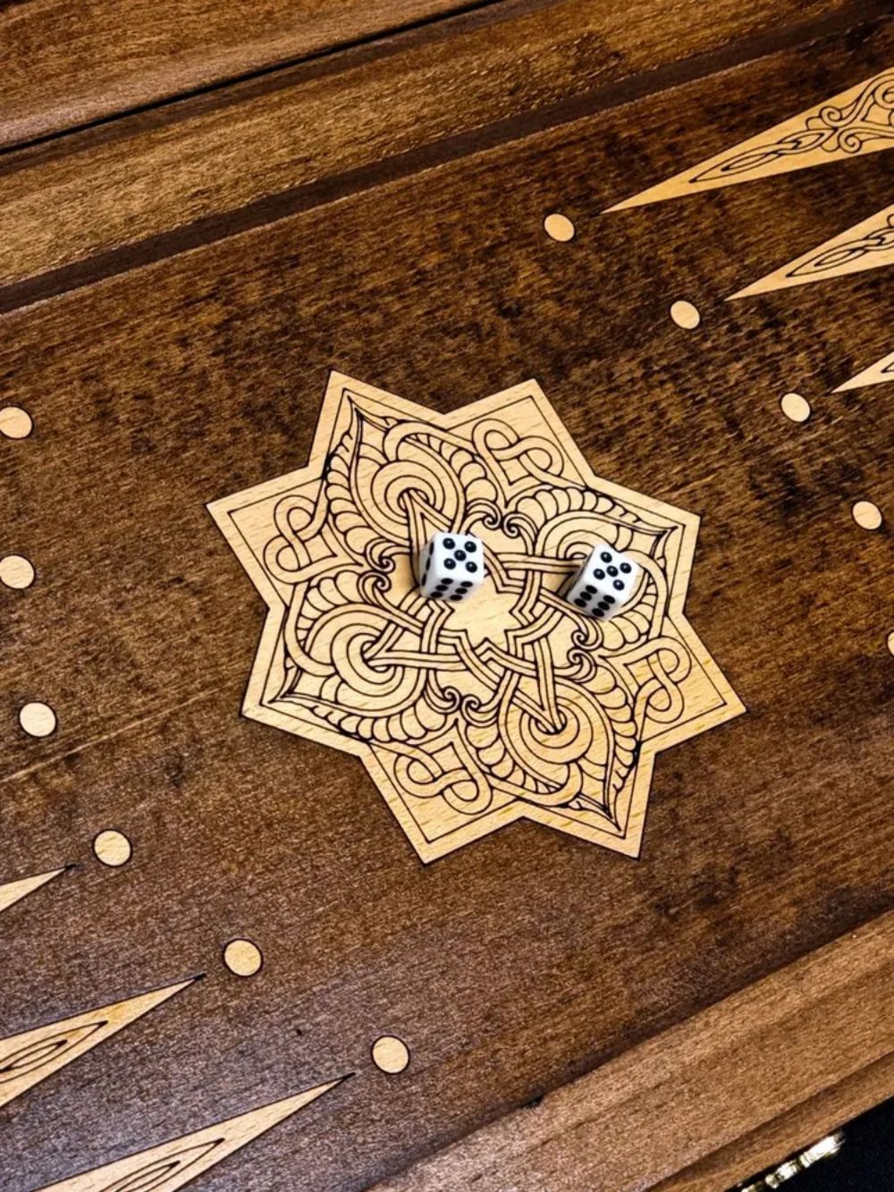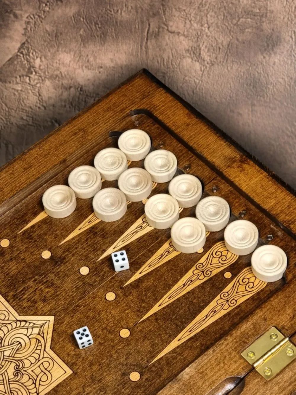Для создания этого экземпляра берется цельный массив дерева бук. Выбор материала был сделан не случайно, ведь работать с ним - одно удовольствие. Благодаря легкости обработки, удается придать поверхностям изысканный внешний вид, подчеркнутый узорами и оформлением. Также бук достаточно прочен, чтобы выдерживать ожесточенные партии, удары фишками о поверхность, и даже падения с небольшой высоты. Примечателен он и своей долговечностью - при правильном уходе, доска прослужит более десятка лет, а может и больше. Ухаживать за ней легко, достаточно смахивать пыль и очищать от следов жирных пальцев, а при долгом хранении пользоваться комплектным чехлом. Он сделан из мягкой ткани, которая не позволит грязи и пыли налипать на поверхности. Вдобавок стоит его использовать при транспортировке, что позволит смягчить тряску в автомобиле и обезопасит от появления микротрещин.