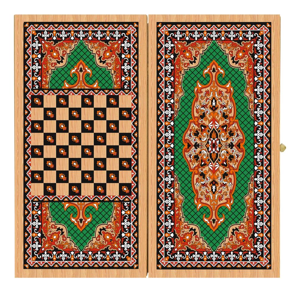 Лицевая и обратная сторона украшены цветным рисунком, нанесённым на светлую обработанную древесину. Сзади имеется поле для шашек, за которыми можно скоротать время между партиями в нарды. Внутри каждая ячейка для фишек, а также центральная часть, оформлены красочным рисунком.